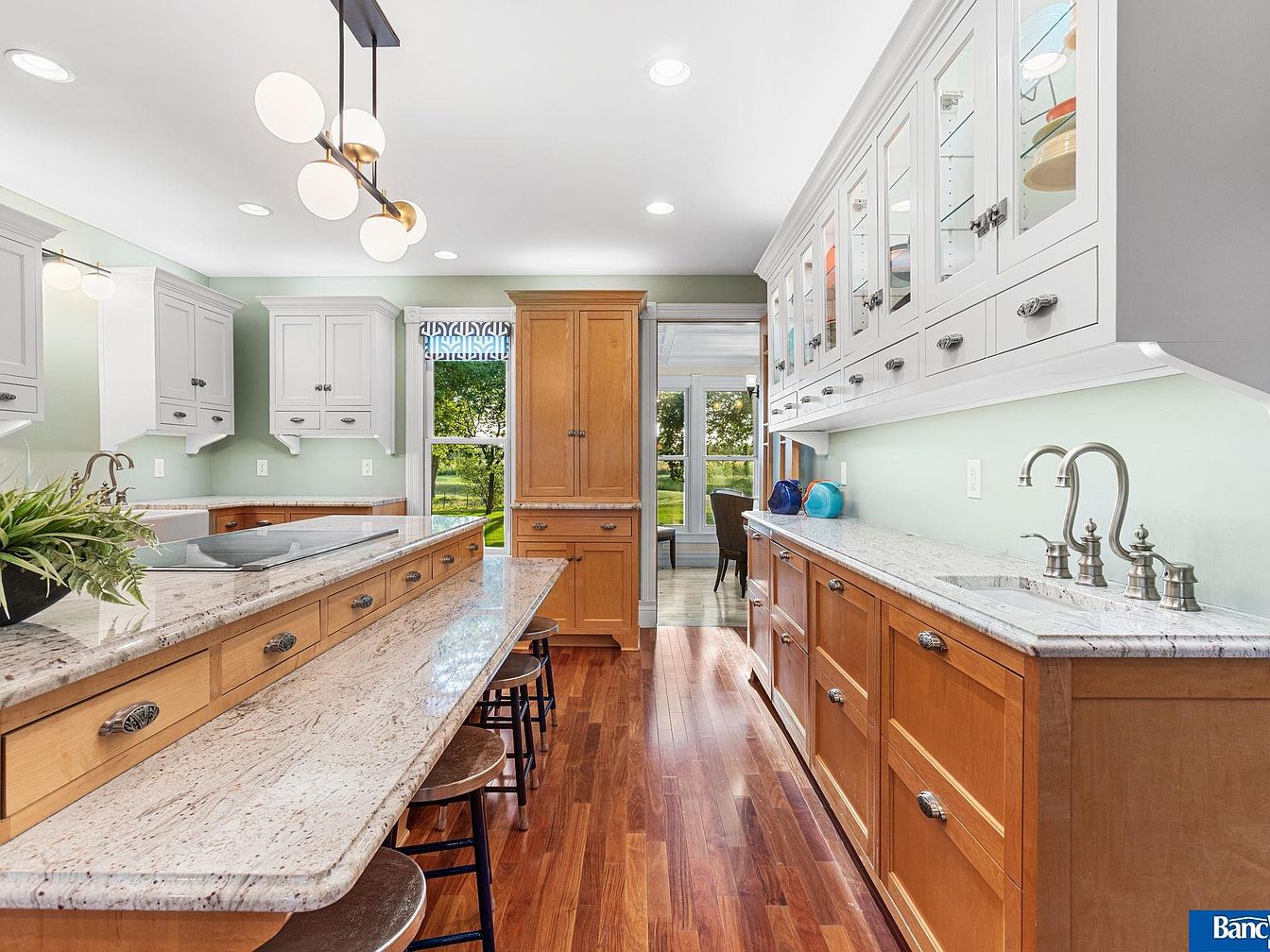 This modern kitchen features an open layout with a blend of hues enhancing its charm. Light mint green walls complement white upper cabinets and rich wooden lower cabinets, creating a vibrant contrast. A spacious countertop of speckled granite runs along the length, allowing for both meal preparation and casual dining with stools positioned beneath. Sleek pendant lighting adds a contemporary touch above the island. Decorative glass cabinet doors showcase colorful dishware, while a large window invites natural light, providing views of the outdoors. Polished hardwood flooring adds warmth and elegance, completing this inviting culinary space.