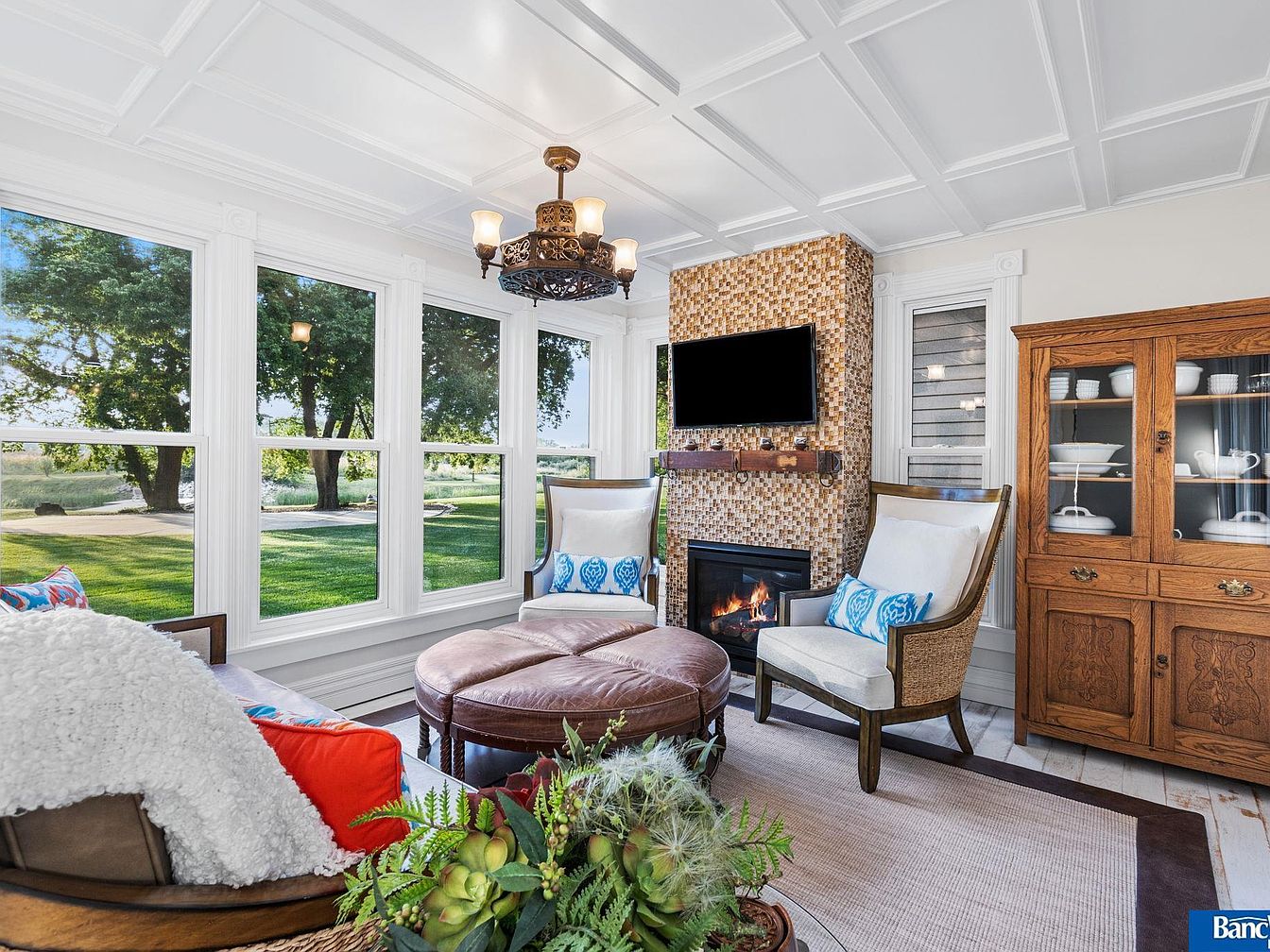A cozy sunroom featuring large windows that allow natural light to fill the space, showcasing a serene view of greenery outside. The white walls and coffered ceiling enhance the airy feel. A plush, round ottoman anchors the seating area, accompanied by two comfortable armchairs adorned with colorful pillows. The fireplace, framed with a mosaic tile surround, offers warmth, complemented by a wooden mantel that holds decor. An elegant wooden cabinet displays fine china. Soft textures are present in the white throw and layered rugs, creating an inviting atmosphere perfect for relaxation or gathering.