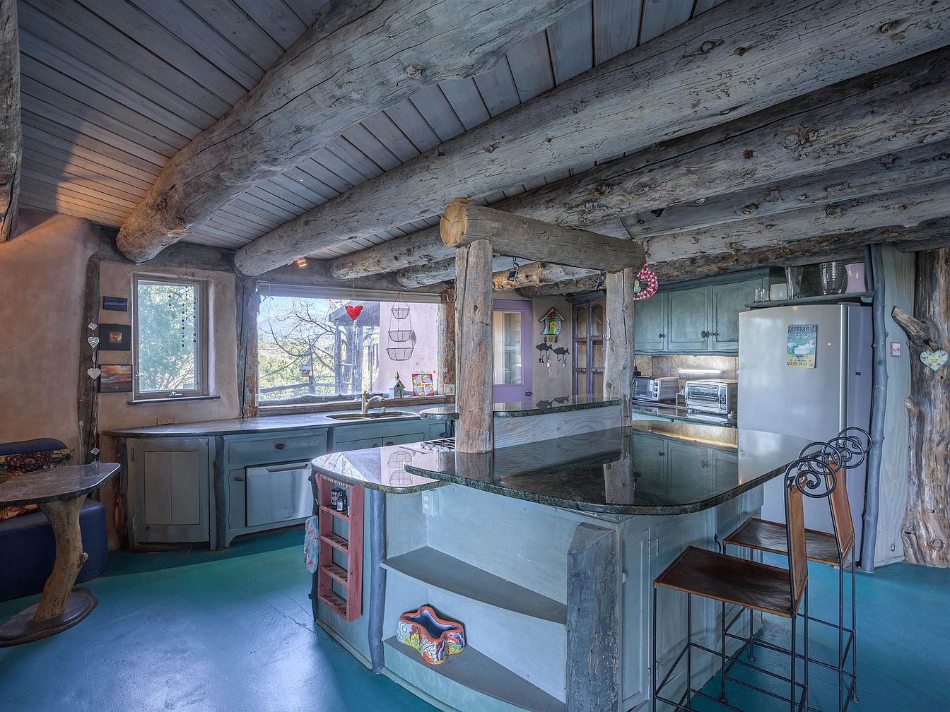 The kitchen features rustic charm with exposed wooden beams and natural log supports enhancing its earthy appeal. A curved countertop made of glossy granite contrasts with the unique, hand-painted cabinetry in a soft blue hue. A vintage style refrigerator stands adjacent to modern appliances, seamlessly blending old-world charm with functionality. The flooring in a bright turquoise adds vibrancy to the space, while a cozy seating area with a round table complements the aesthetic. Natural light floods in through a large window, showcasing a scenic view outside, enhancing the inviting atmosphere of this eclectic culinary haven.