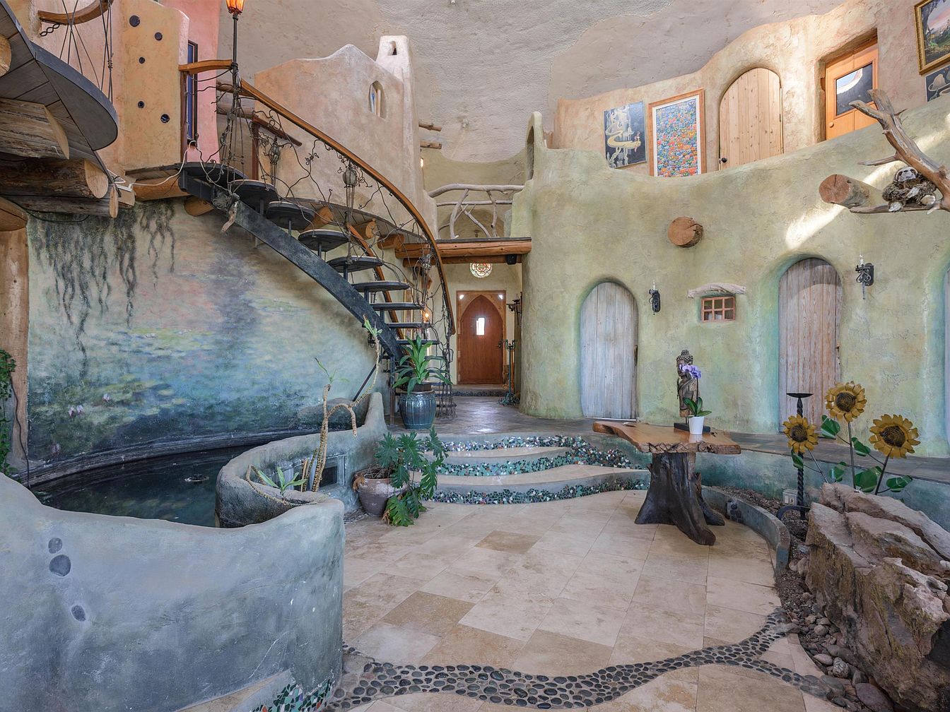 This entry foyer blends organic design with rustic charm. A sweeping spiral staircase made of dark wood ascends, flanked by curved, textured walls in earthy tones of green and peach. Natural light floods the space through a large, rounded window and small arched doorways lead to other areas. A serene pond runs along the wall, surrounded by lush plants, enhancing a tranquil atmosphere. A wooden table crafted from a single slab of wood stands at the center, adorned with potted orchids. Decorative elements include whimsical artwork and polished stones embedded in the floor, creating an inviting, earthy aesthetic.