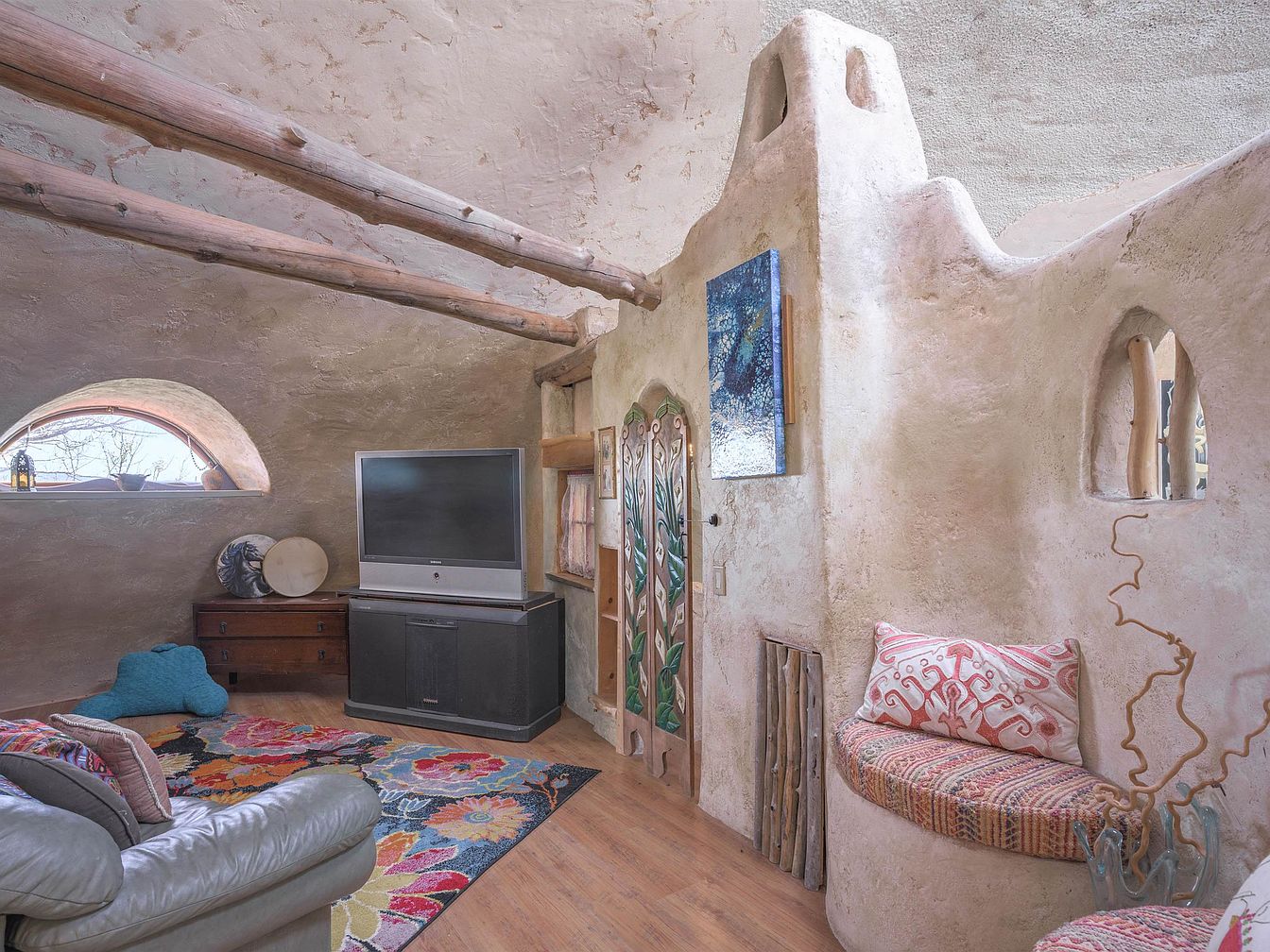 This cozy living room features earthy tones with textured clay walls and rustic wooden beams on the ceiling, conveying a natural aesthetic. A large flat-screen TV rests on a sleek black cabinet, adjacent to a quaint wooden chest offering traditional charm. The area is anchored by a vibrant floral rug that adds a burst of color against the warm wooden flooring. Curved seating nooks with decorative cushions provide comfort, while a unique carved door showcases intricate design work. Small rounded windows invite soft natural light, enhancing the space’s inviting atmosphere while maintaining a sense of rustic elegance.