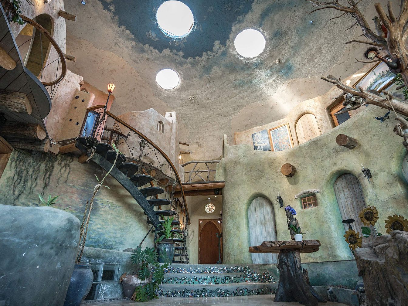 A spiraling staircase gracefully ascends into a circular entryway adorned with earthy tones and organic textures. The walls showcase a soft blend of ochre, beige, and muted greens, creating a warm, welcoming ambiance. Circular skylights punctuate the ceiling, allowing natural light to flood the space, highlighting artistic details and the unique plasterwork overhead. Decorative elements include wooden beams and a handcrafted wooden table made from rustic logs, accentuated by potted plants and a scattering of colorful mosaic tiles on the ground. This artistic blend of nature-inspired design and whimsical architectural elements evokes a cozy, inviting atmosphere.