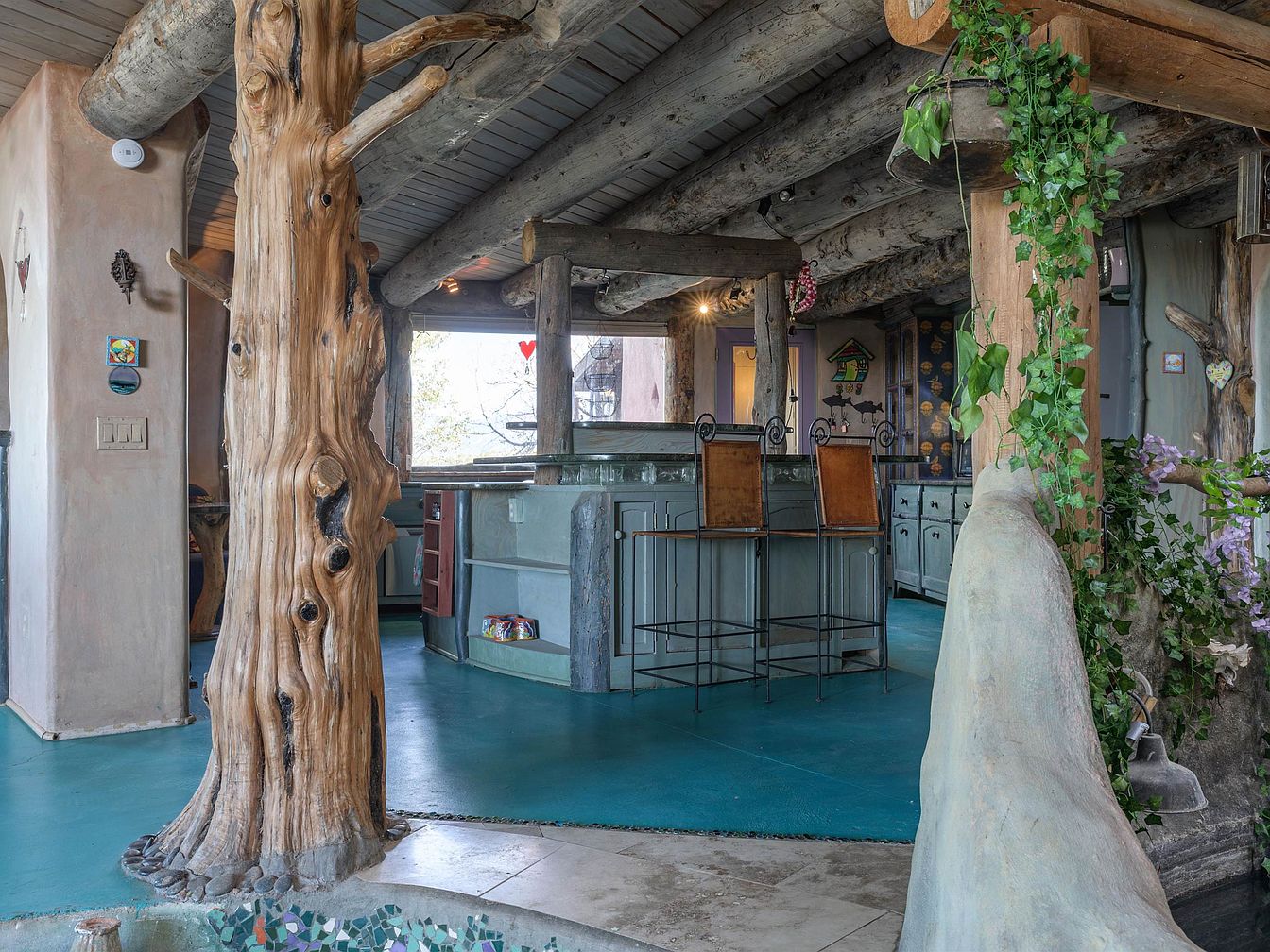 The kitchen features a unique blend of rustic and contemporary design. A large natural wooden column, resembling a tree trunk, serves as a striking centerpiece, surrounded by a vibrant turquoise floor that enhances the openness of the area. The countertops are a sleek blue-gray, harmonizing with the cabinetry that showcases a mix of colors, including deep reds and greens. Metal bar stools with simple backs offer seating at a quaint counter, while decorative elements, such as potted plants and handmade wall art, add organic warmth. Natural light floods in from large windows, creating an inviting atmosphere.